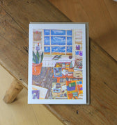 This beautiful greetings card features an intricate collage design showing the interior of an artist's studio by the sea.